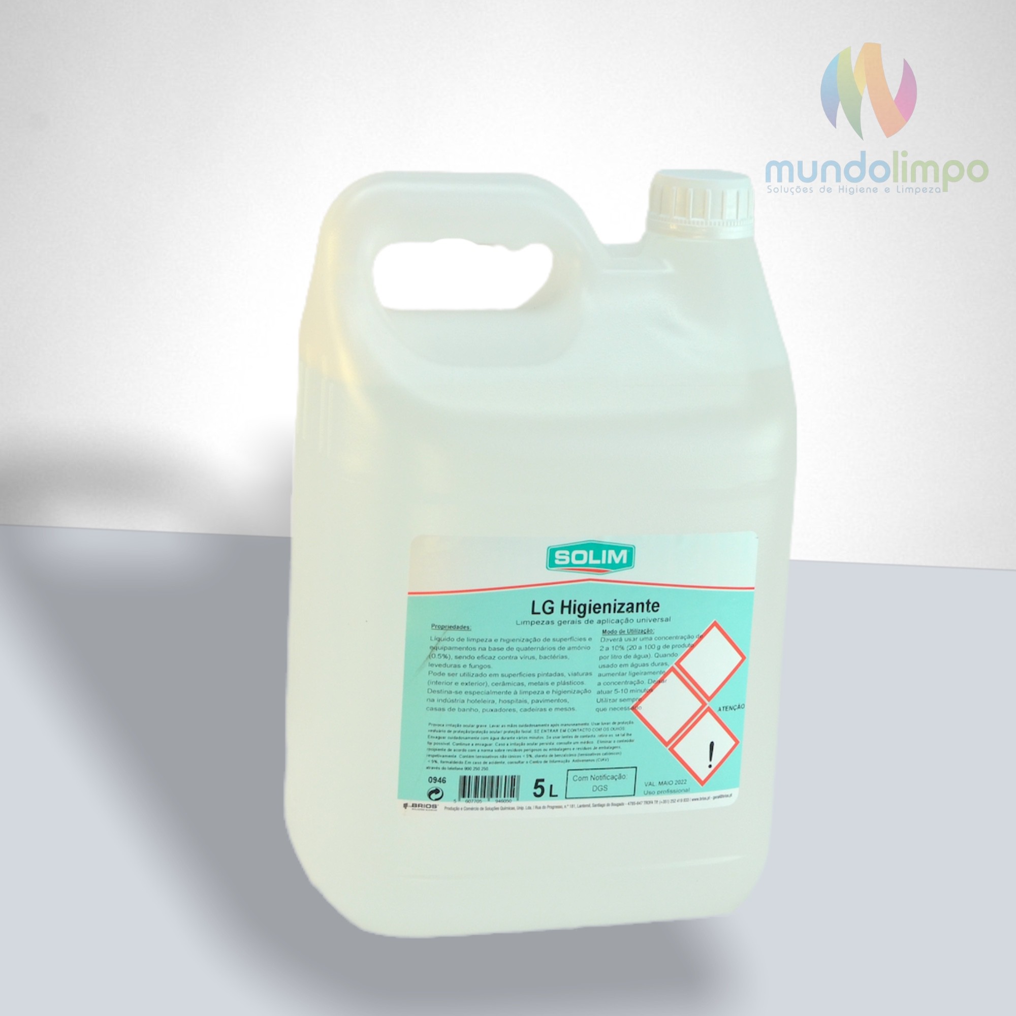 Detergente líquido de limpeza e higienização. Possui, na sua composição quaternários de amónio (0.5%).