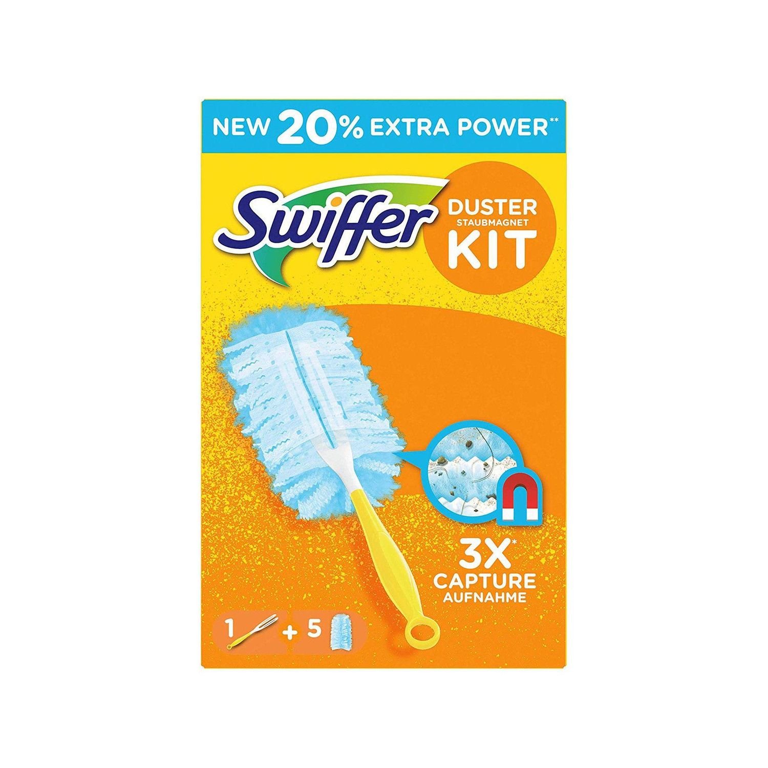 Kit Swiffer Duster com uma alça ergonômica confortável e 5 panos de pó reutilizáveis.